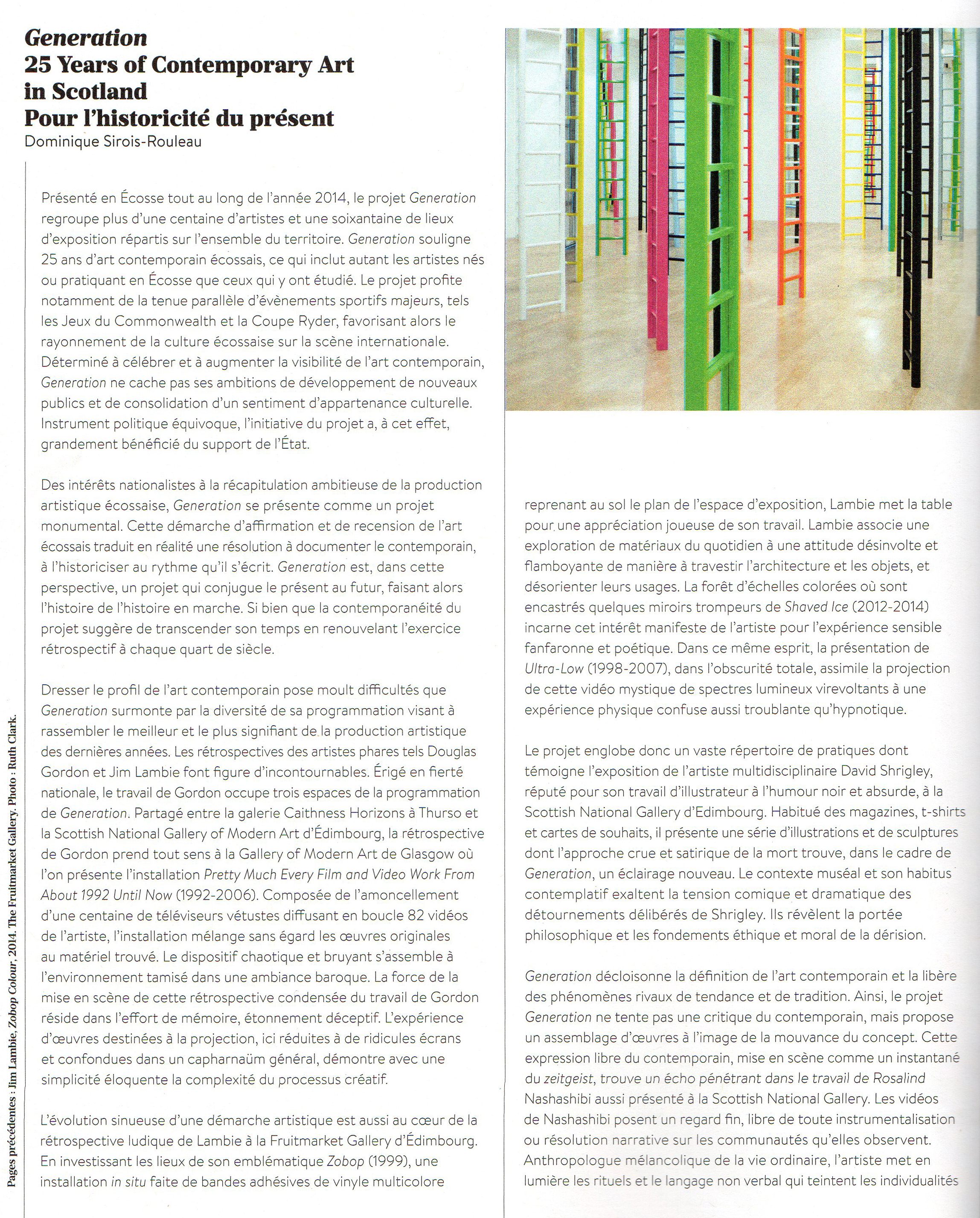 Présenté en Écosse tout au long de l’année 2014, le projet Generation regroupe plus d’une centaine d’artistes et une soixantaine de lieux d’exposition répartis sur l’ensemble du territoire. Generation souligne 25 ans d’art contemporain écossais, ce qui inclut autant les artistes nés ou pratiquant en Écosse que ceux qui y ont étudié. Le projet profite notamment de la tenue parallèle d’évènements sportifs majeurs, tels les Jeux du Commonwealth et la Coupe Ryder, favorisant alors le rayonnement de la culture écossaise sur la scène internationale. Déterminé à célébrer et à augmenter la vi sibi lité de l’art contemporain, Generation ne cache pas ses ambitions de développement de nouveaux publics et de consolidation d’un sentiment d’appartenance culturelle. Instrument pol itique équivoque, l’initiative du projet a, à cet effet, grandement bénéficié du support de l’État.