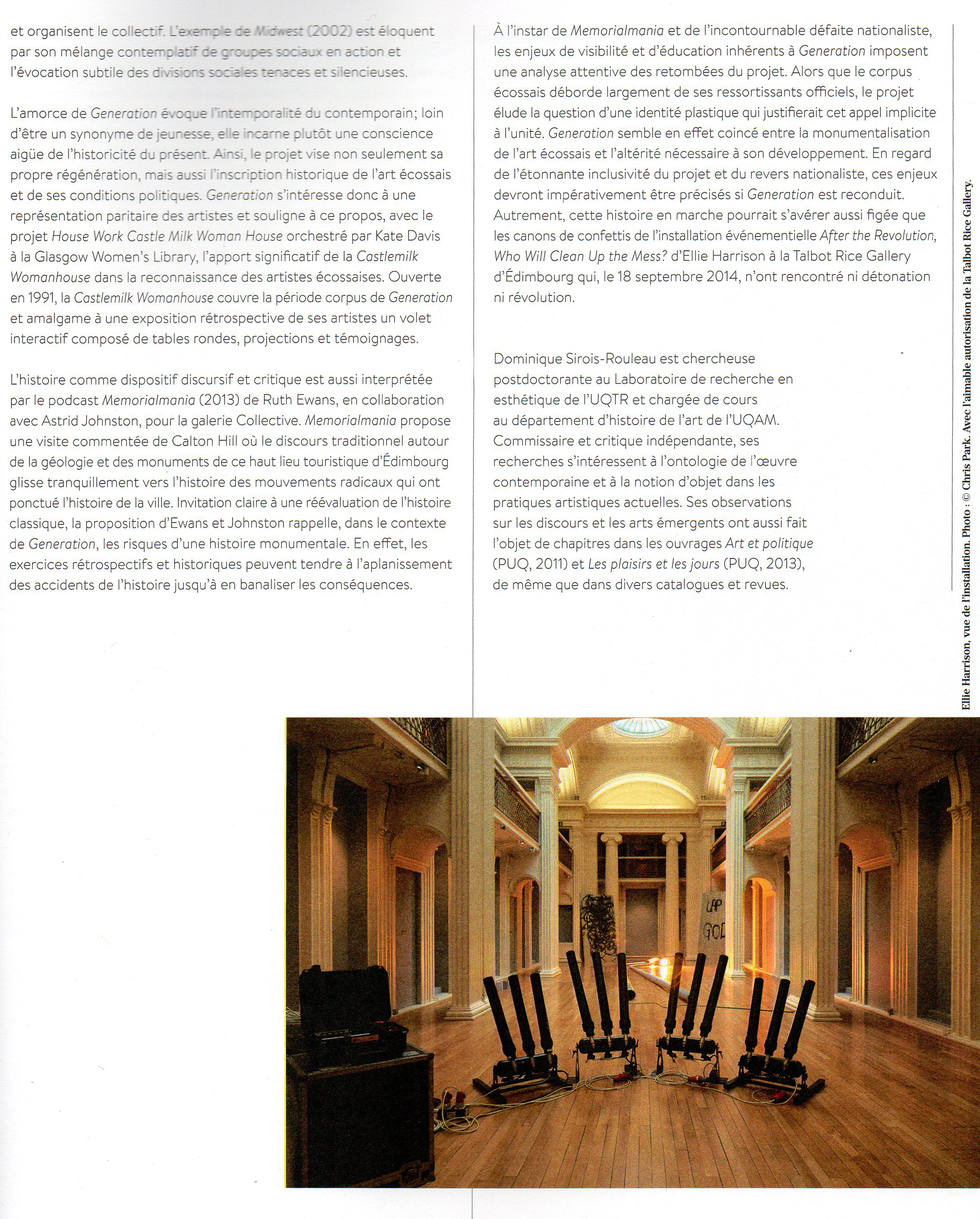 À l’instar de Memoriolmanio et de l’incontournable défaite nationaliste, les enjeux de visibi lité et d’éducation inhérents à Generation imposent une analyse attentive des retombées du projet. Alors que le corpus écossais déborde largement de ses ressortissants officiels, le projet élude la question d’une identité plastique qui justifierait cet appel implicite à l’unité. Generation semble en effet coincé entre la monumentalisation de l’art écossais et l’altérité nécessaire à son développement. En regard de l’étonnante inclusivité du projet et du revers nationaliste, ces enjeux devront impérativement être précisés si Generation est reconduit. Autrement, cette histoire en marche pourrait s’avérer aussi figée que les canons de confettis de l’installation événementielle After the Revolution, Who Will Cleon Up the Mess? d’Ellie Harrison à la Talbot Rice Gallery d’Édimbourg qui, le 18 septembre 2014, n’ont rencontré ni détonation ni révolution.